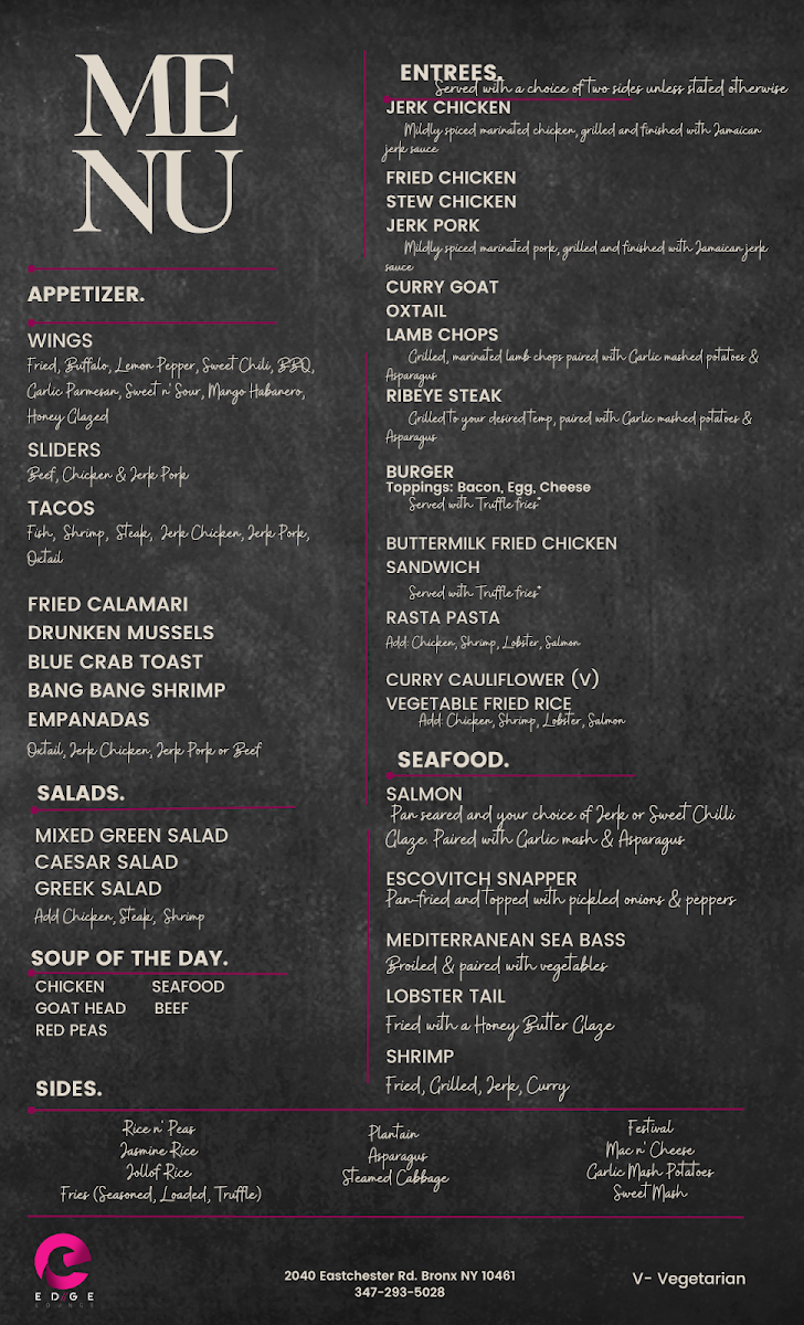 If you’re curious about what’s on offer at Edge Restaurant & Lounge Menu, get ready to explore a mix of flavors that feel both comforting and inventive. From the first glance, the variety jumps out-whether you’re in the mood for hearty classics or something a bit more adventurous, there’s something here to catch your eye. Appetizers tease with bold spices and fresh ingredients, while main courses bring a satisfying balance of taste and presentation. You might find yourself lingering over dishes that are as visually appealing as they are delicious, each bite revealing careful attention to flavor and texture. Pair your meal with a selection from their drinks menu, and it quickly turns into more than just a meal-it’s a full experience. Nestled at 2040 Eastchester Rd, Bronx, NY, the menu feels like a journey through familiar favorites with unexpected twists, keeping every visit fresh and inviting.